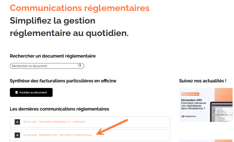 Pour retrouver vos données dans Winpharma, rendez-vous dans le menu : Stock > Analyses statistiques > Déclaration ARS – CA et suivez la procédure disponible sur la page “Communications réglementaires”.